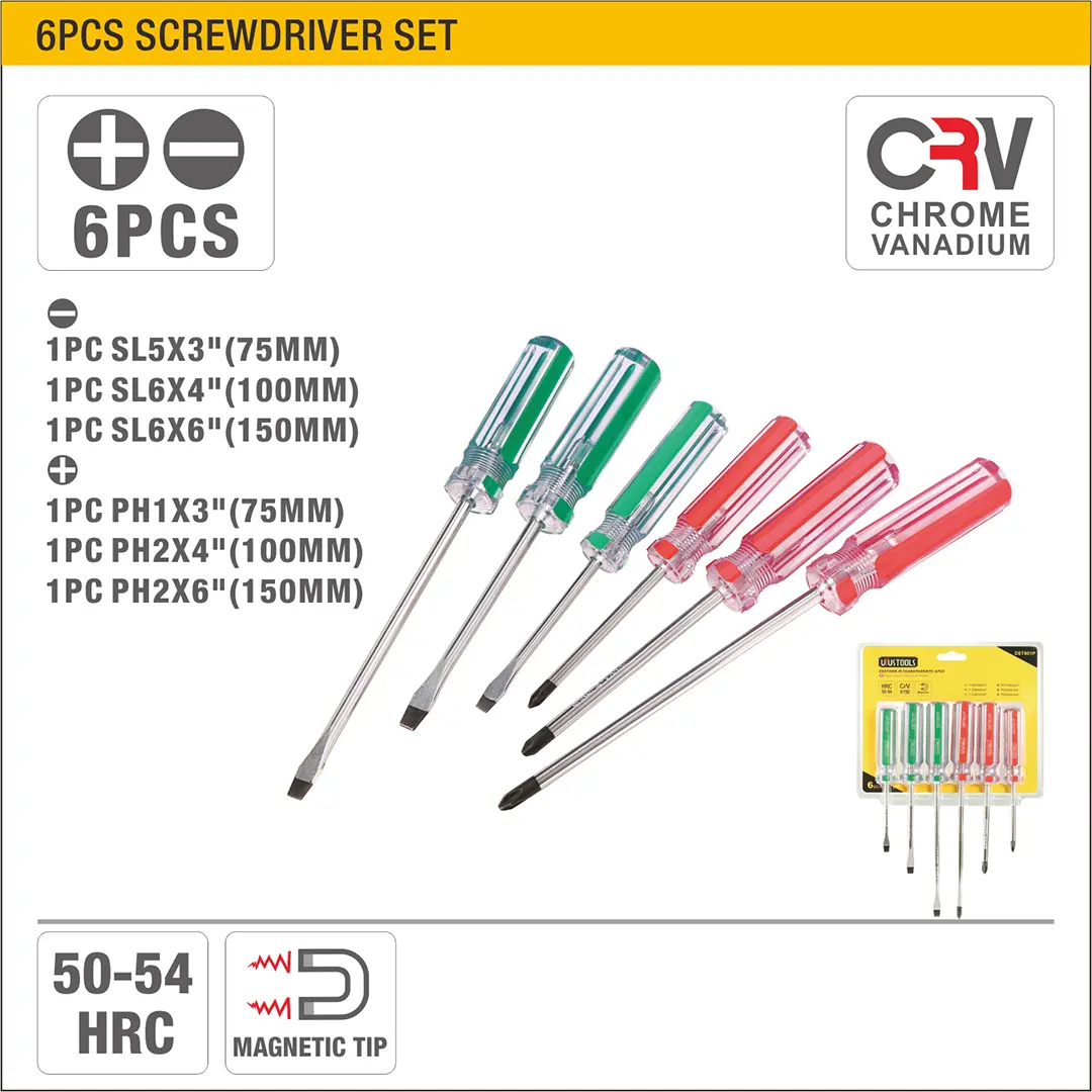 UYUS JUEGO DE 2 PCS DE DESTORNILLADORES MIXTO DE MANGO PLÁSTICO (PUNTA IMÁNTADA) – 5X75MM,6X100MM,6X150MM,PH1X75MM,PH2X100MM,PH2X150MM