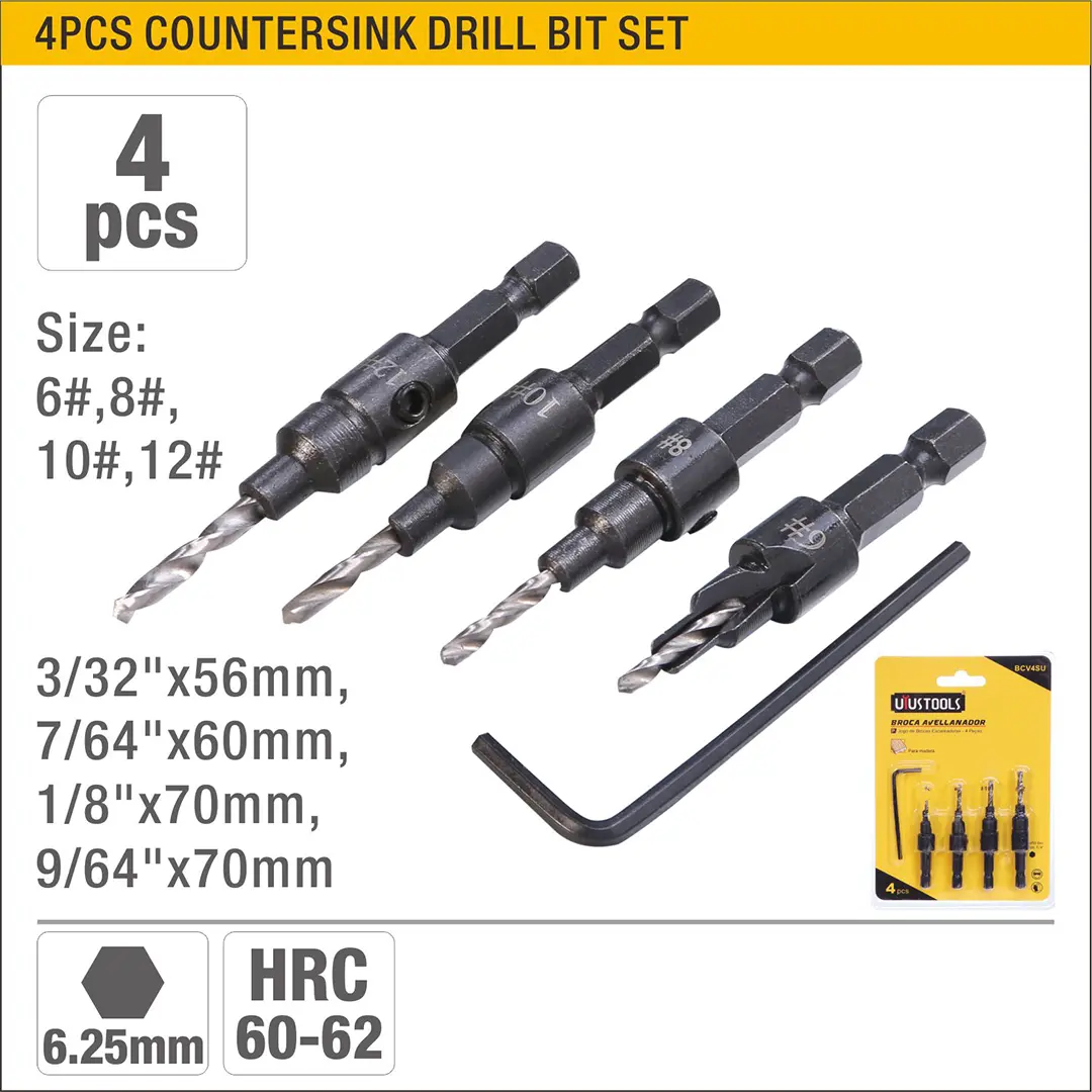 UYUS JUEGO DE 4 PCS DE BROCAS AVELLANADORAS DE MANGO HEXAGONAL – 6#8#10#12#