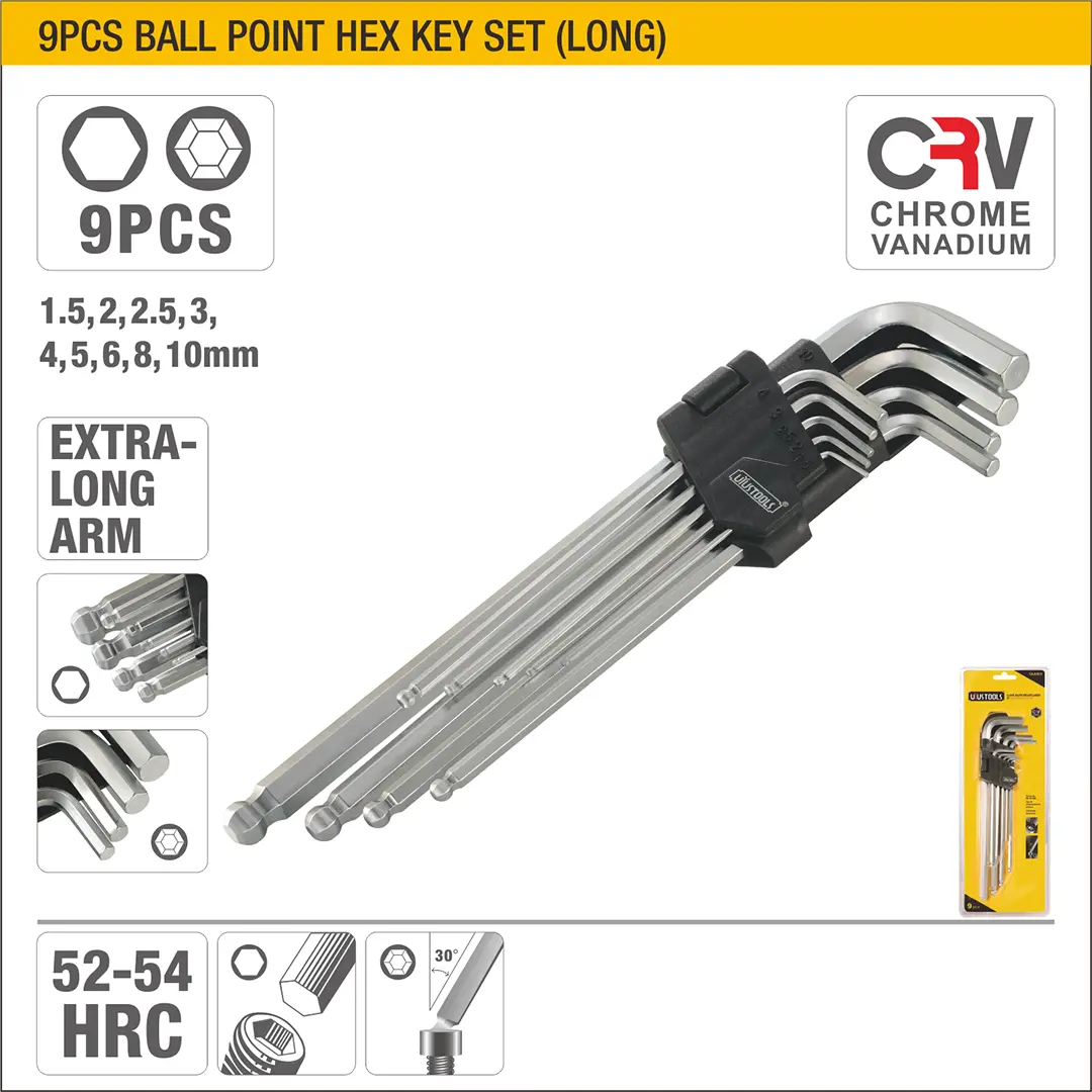 UYUS JUEGO DE 9 PCS DE LLAVES HEXAGONALES DE PUNTA DE BOLA (LARGO) – 1.5MM,2MM,2.5MM,3MM,4MM,5MM,6MM,8MM,10MM