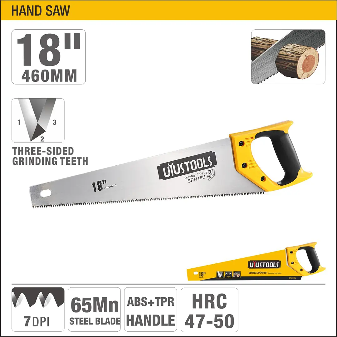 1. Hoja de acero 65Mn 2. ABS con mango TPR 3. Grosor: 0,9 mm, 7TPI 4. Diente rectificado triple 5. Diente endurecido por inducción 6. Embalado en funda de color